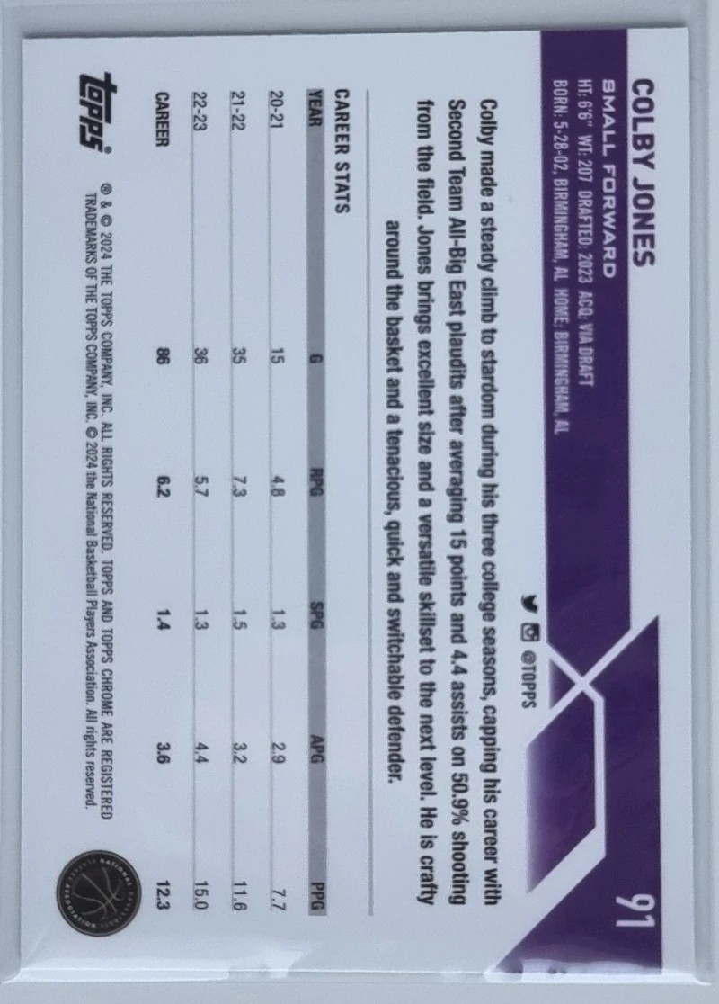• 2023-24 Topps Chrome Blue Basketball Refractors #91 Colby Jones